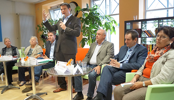 Über das Thema Demenz diskutierten (von links) die pflegenden Angehörigen Christa Ficht und Liane Deusel, Geriatrie-Chefarzt Dr. Frank Schröder, MdL Steffen Vogel, Gerhard Wagner von der Deutschen Alzheimergesellschaft, Moderator Dr. Martin Sage und Heimleiterin Ulrike Rüth.