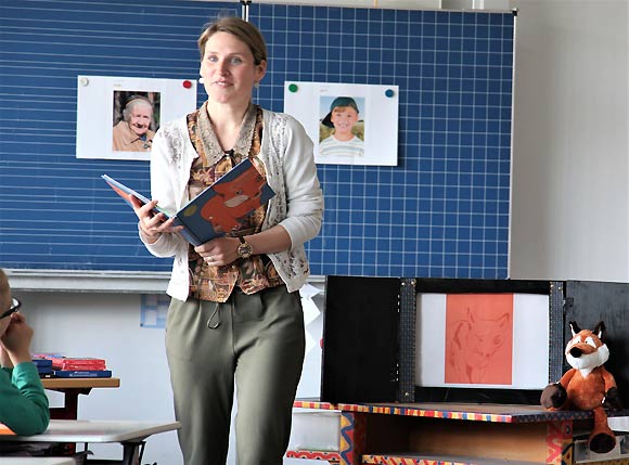 Unterstützt durch Schaubilder und einem Fuchs als Kuscheltier liest Pädagogin Lisa Geyer die Geschichte „Vom Fuchs, der den Verstand verlor“ vor und bringt den Kindern so das Thema Demenz nahe. (Foto: Michael Will / BRK)
